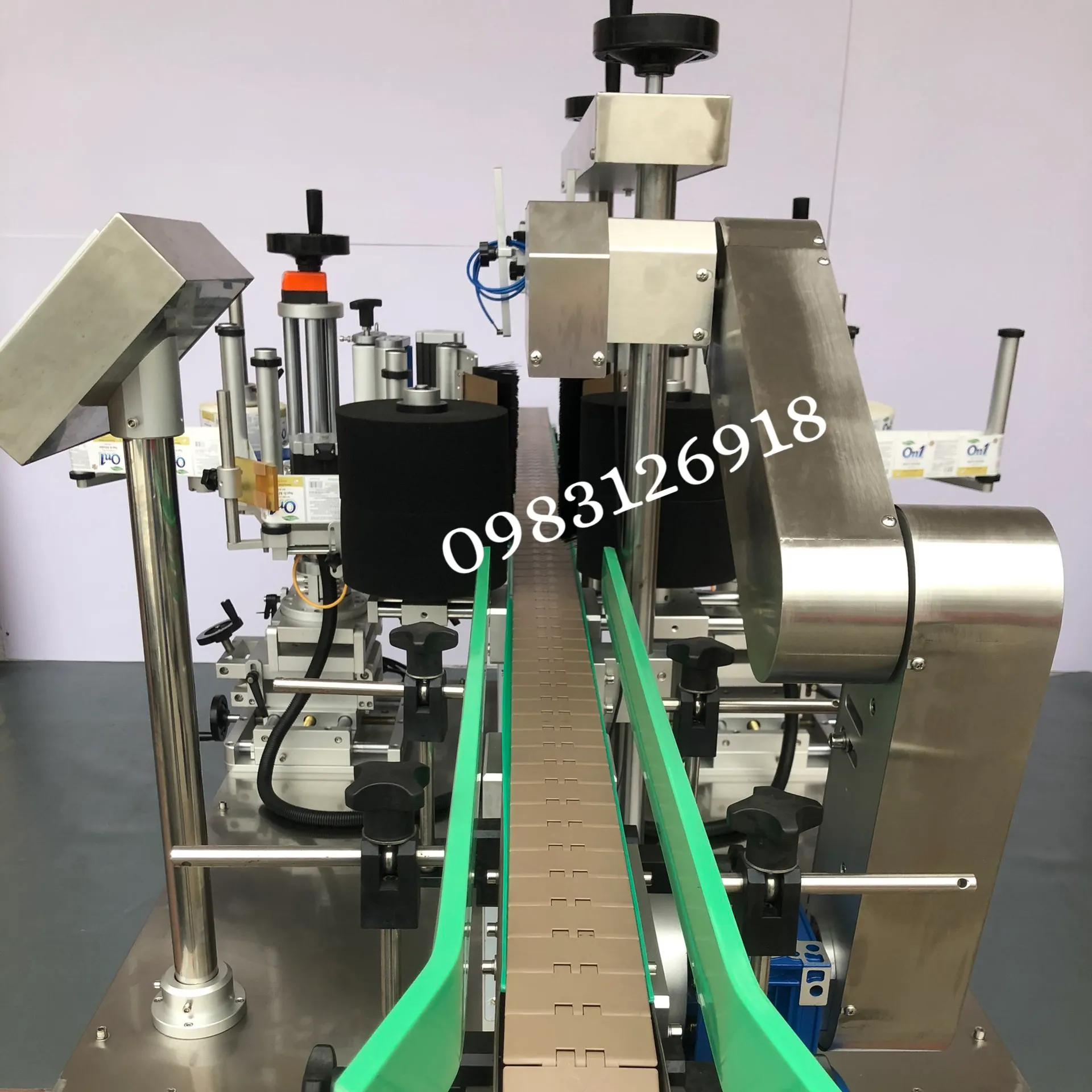 – Automatische Sensoren, Förderband, 2 Etikettierköpfe/ -flügel