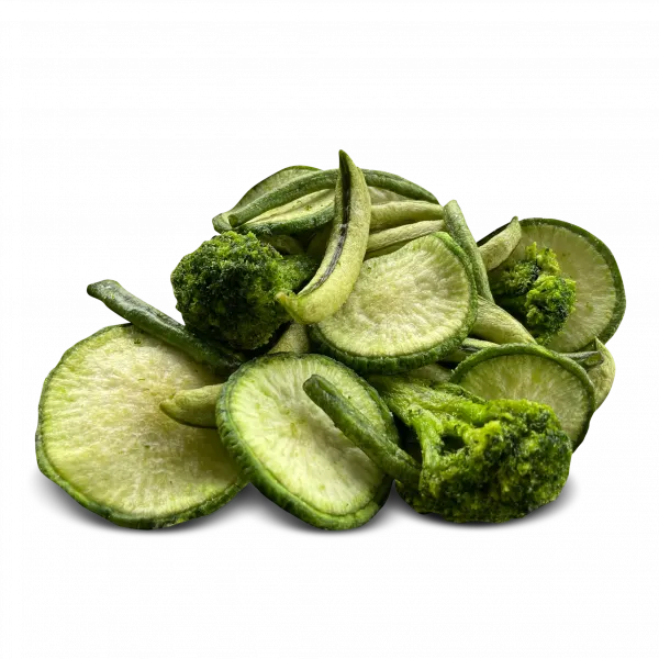Ingredients: Vegetables (73%) (Green Cabbage, Broccoli, Snap Peas, Cowpeas), vegetable oil, malt syrup, seasoning (Maltodextrin, salt, yeast extract, natural flavoring, spices, vegetable powder (onion, garlic), sunflower oil, turmeric)