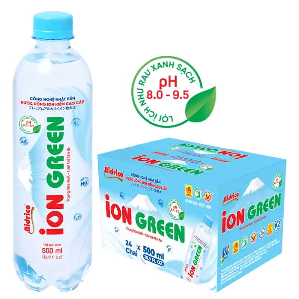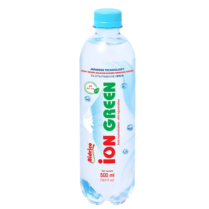 Premium Alkaline Ionized Water ION GREEN 500ml bottle is created from electrolysis technology, separating water into H+ and OH- ions, with a natural alkaline pH of 8.0 – 9.5. The product is manufactured on a closed automated production line, integrating modern electrolysis technology from Japan.