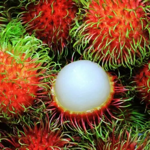 Rambutan is a tropical fruit native to Southeast Asia, particularly popular in Vietnam, Thailand, and Indonesia. The fruit is round or oval, 3–6 cm in diameter, with a red or yellow shell covered in soft, hair-like spines, creating a unique and eye-catching appearance.