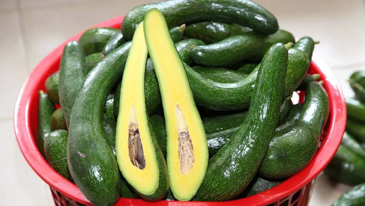 Avocado 034 is a fruit tree suitable for tropical climates, especially in areas like Bao Loc, Lam Dong, and the Central Highlands provinces. Avocado 034 has dark green, thin skin, and long fruit. The avocado flesh is yellow with green around the edges. This is a type of avocado with high plasticity, especially delicious due to its rich and creamy texture.