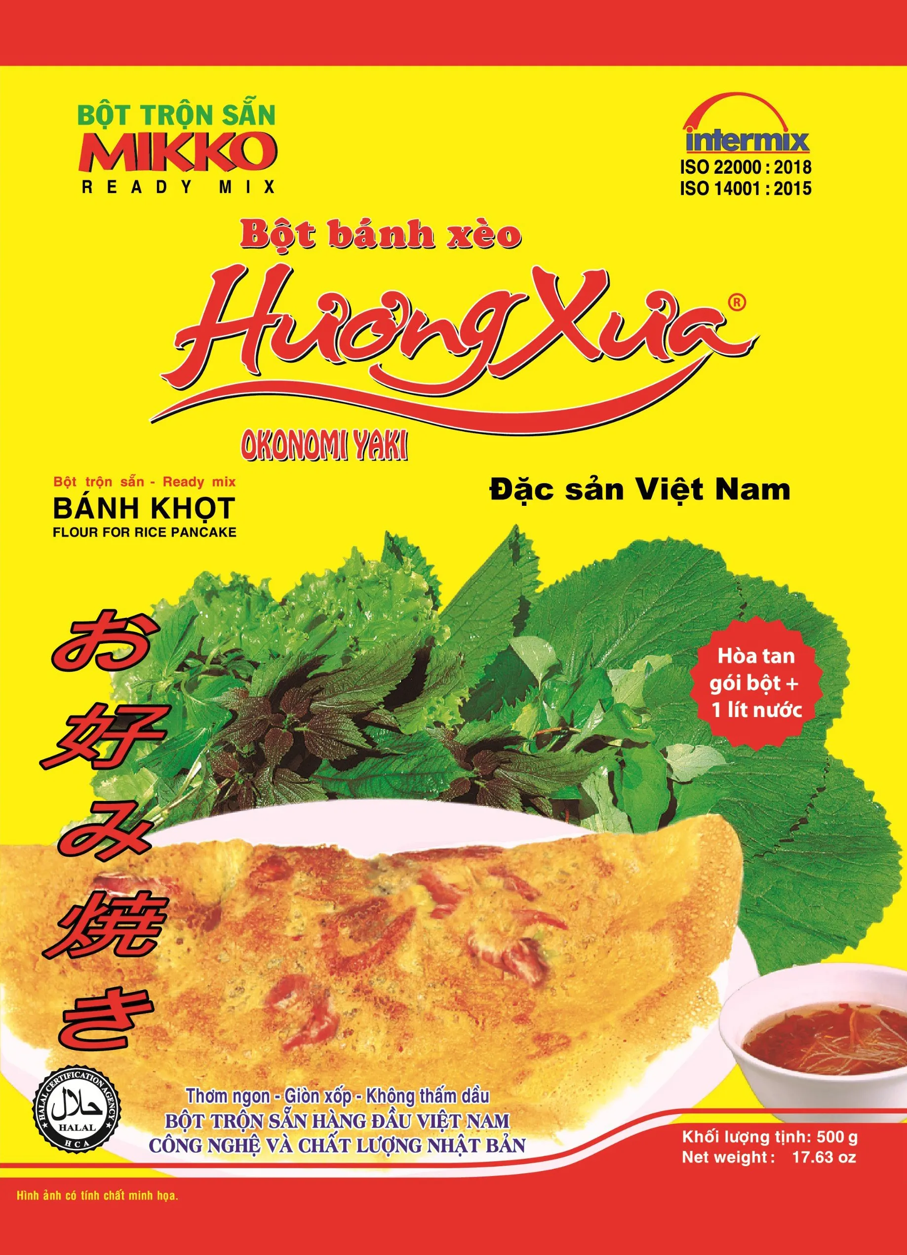 Hương Xưa rice flour for making Banh Xeo and Banh Khot – thin, crispy pancakes that don't absorb much oil. It has a distinct green onion aroma and the characteristic flavor of Southern Vietnamese Banh Xeo; it can also be used to make Banh Khot.