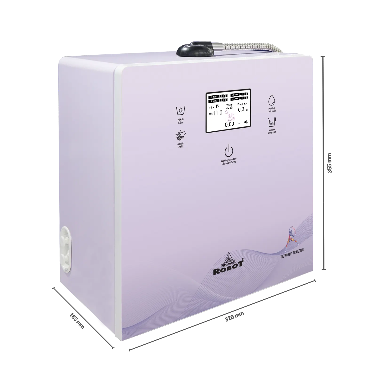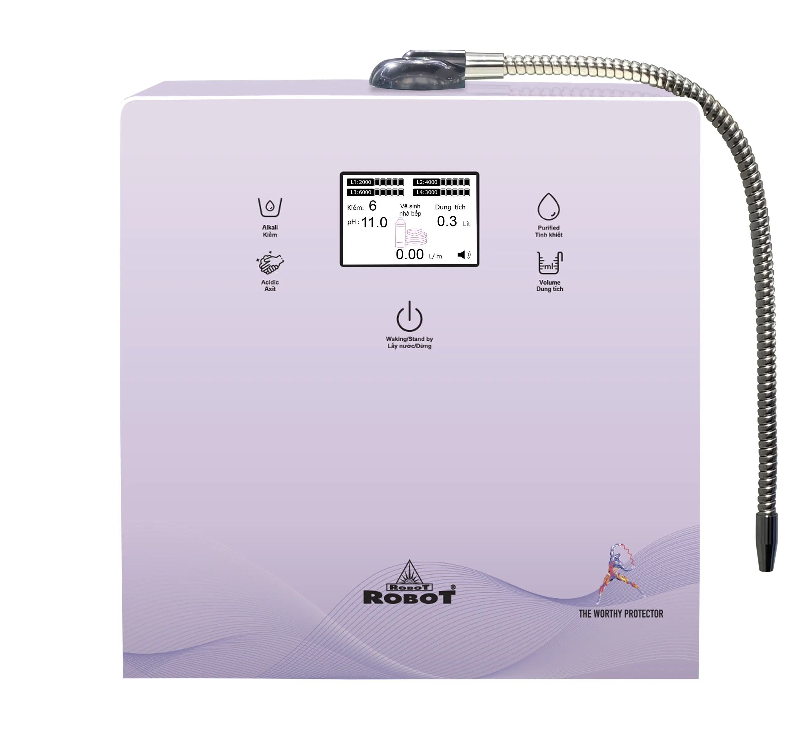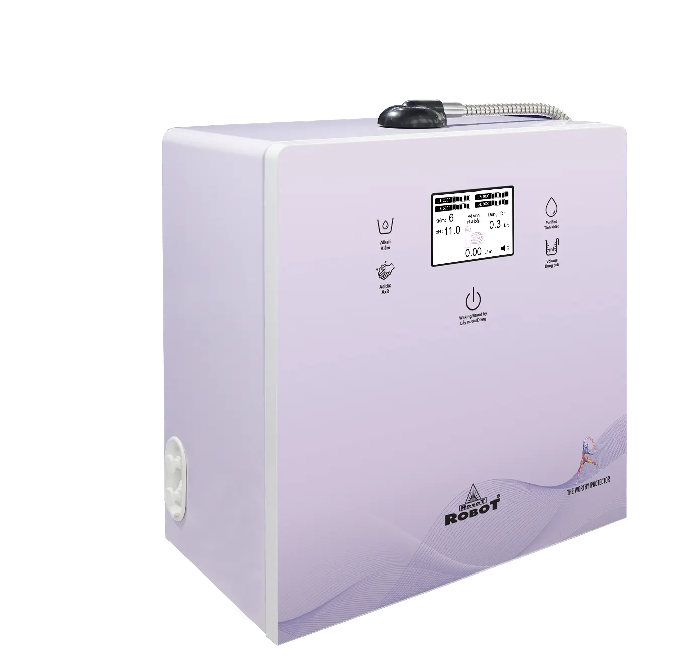 Especially, ROBOT is the first manufacturer in the world to produce an Alkaline Ionized Water Purifier with an additional smart hot water function, allowing users to select the volume and temperature of hot water at 45/60/80/99°C instantly without heating, and a cold water function from 10-12°C, achieving an Asian and World Record (refer to information on ionSmart, ionQueen, ionKing models).