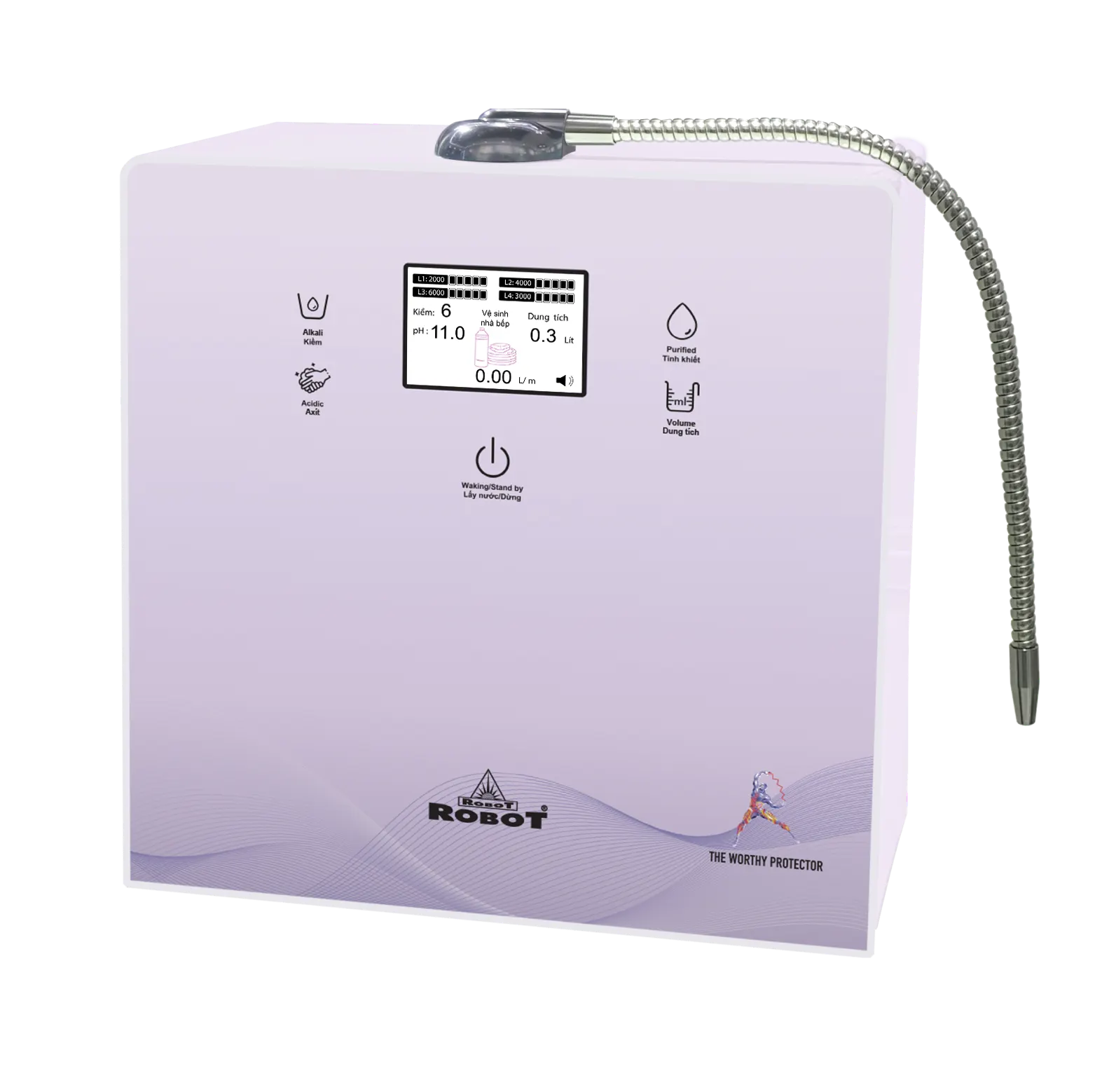 ROBOT alkaline ionized water purifiers proudly feature a New Generation product with advanced technology, a high-end filtration system & large-sized flat cast Platinum-coated Titanium electrodes manufactured in Korea.