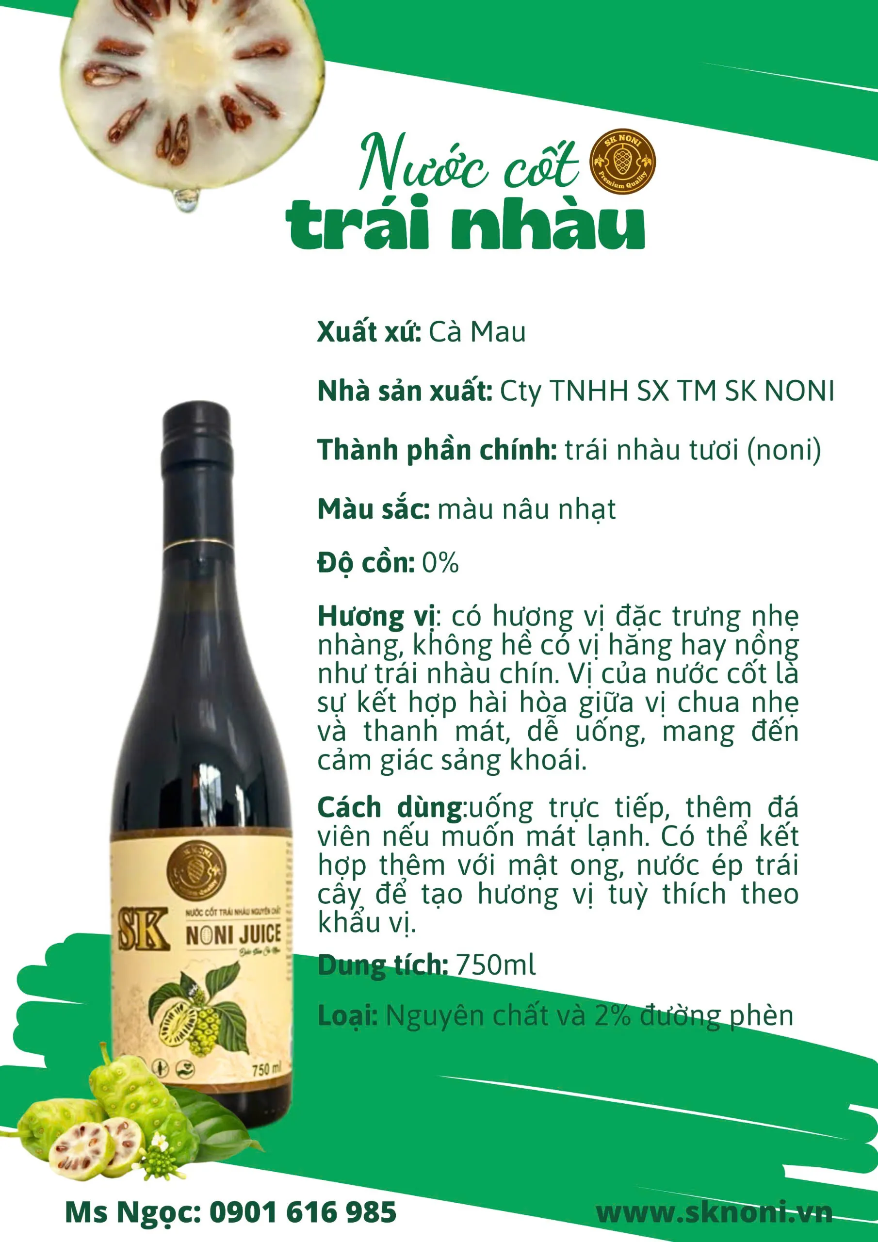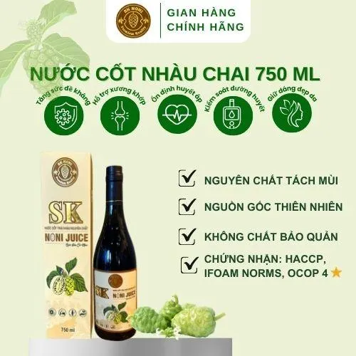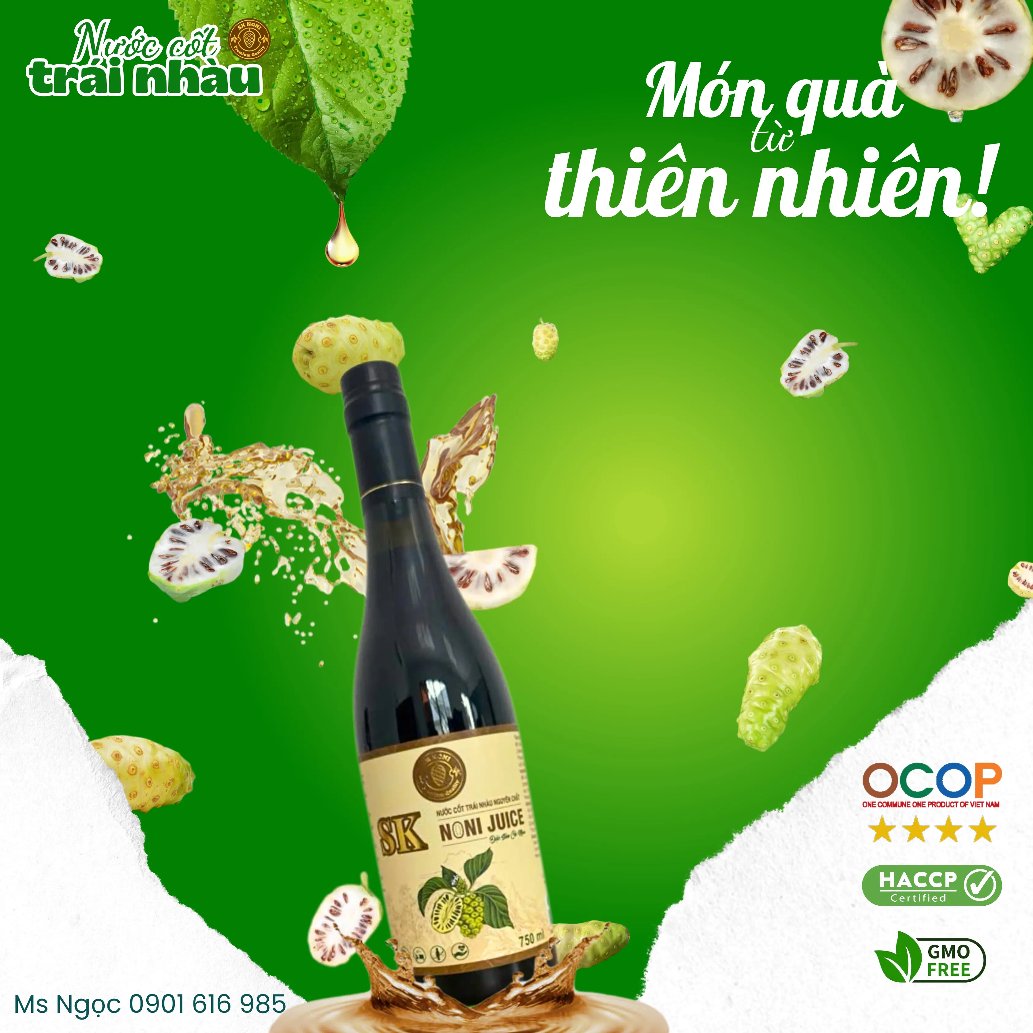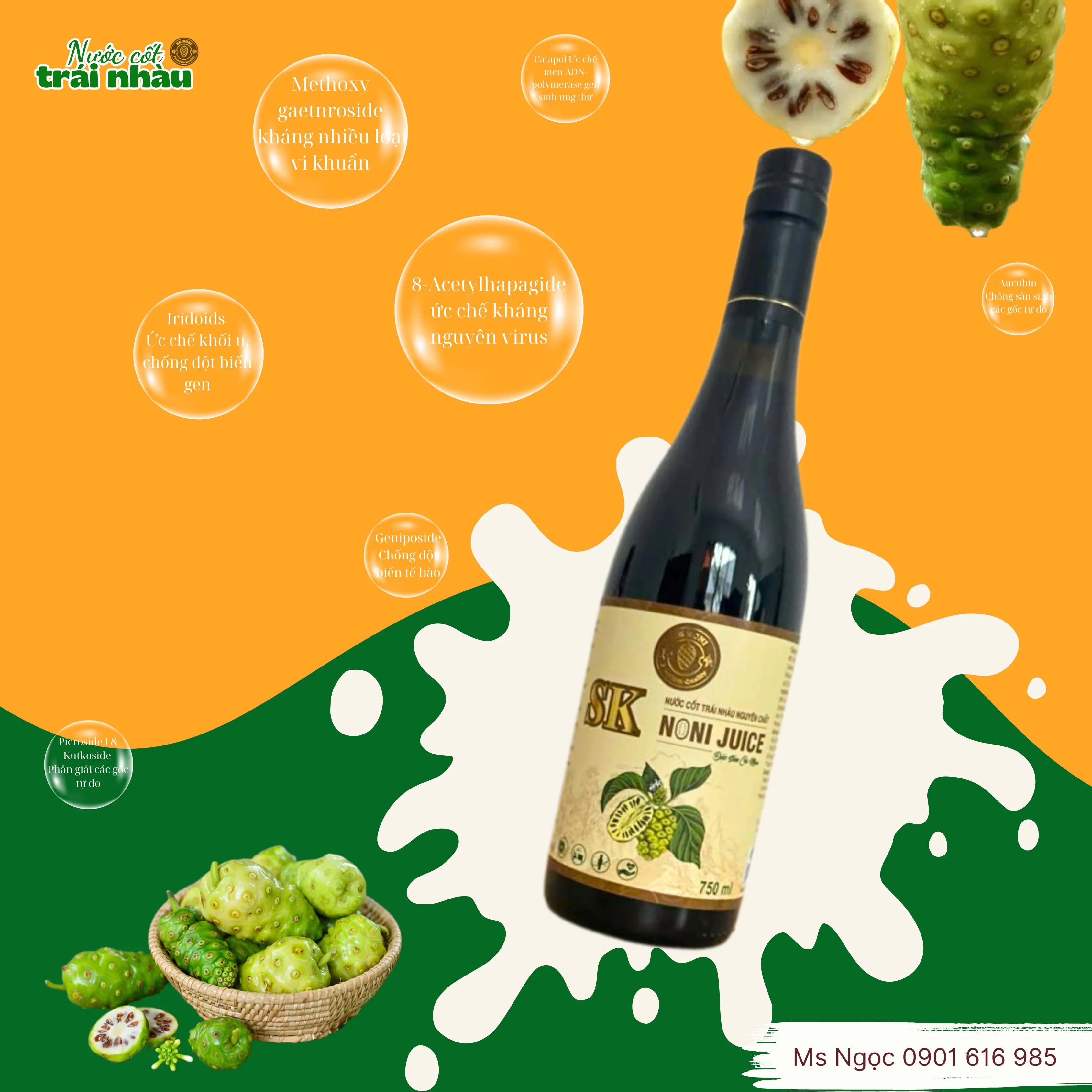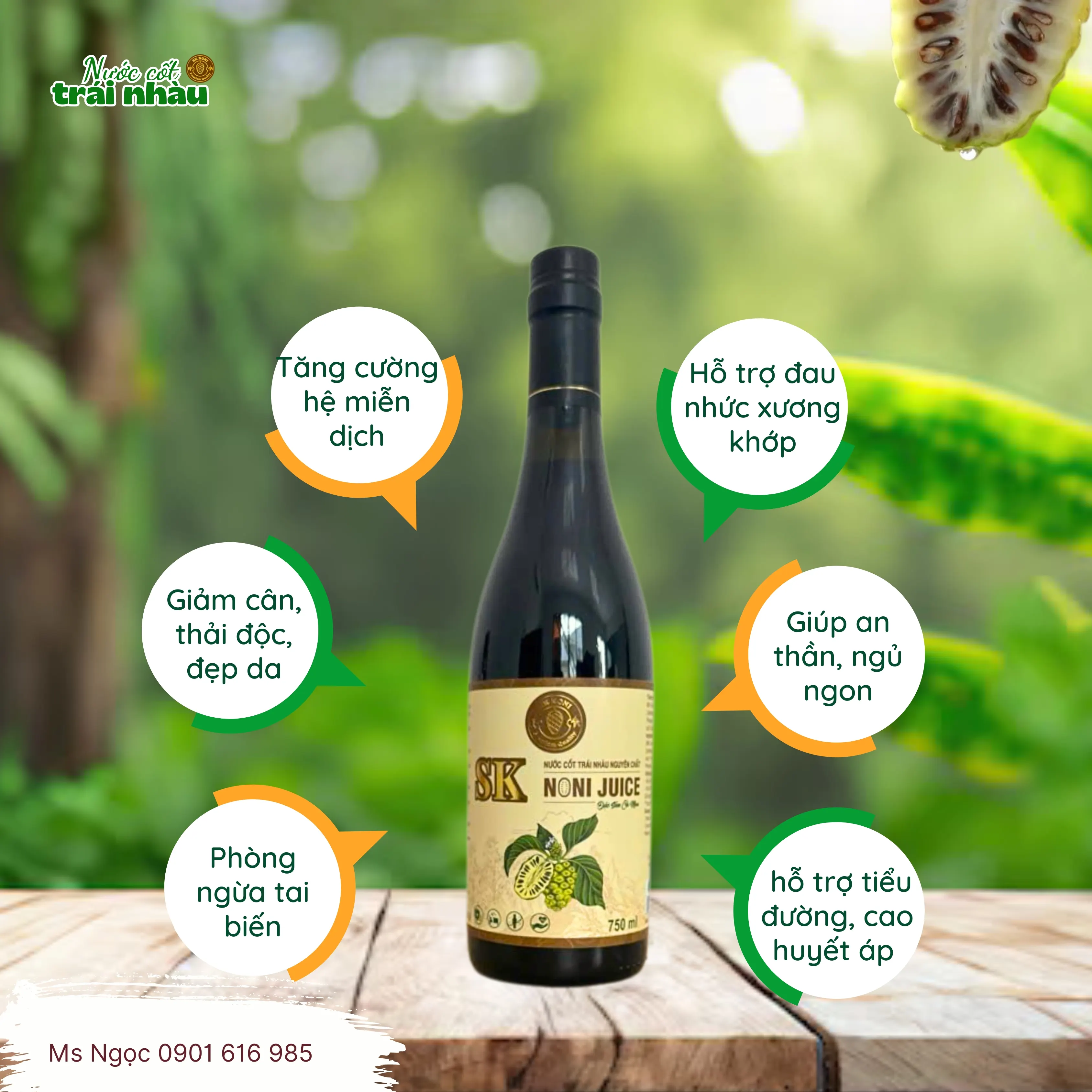 SK NONI Noni Juice is a noni juice extract from Morinda Citrifolia fruit, grown in a separate planned garden and strictly controlled from planting, technical care; no chemical fertilizers, no pesticides. Pure natural noni juice with a high content of substances such as: Mg, Ca, amino acids, carotene, Vitamin C, Vitamin B group, Fe, K, Na,… has the effect of supplementing essential nutrients, beneficial for health; support to prolong youth.