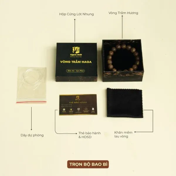The high-grade dark brown HAGA agarwood bracelet comes in sizes 6mm, 8mm – with 25 dark brown agarwood beads with high agarwood oil content.