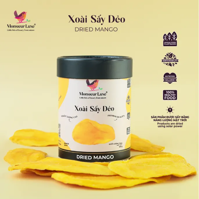 Monsieur Luxe se enorgullece de presentar el mango seco blando elaborado con los mangos más frescos y deliciosos, mediante un proceso de secado moderno con energía solar, garantizando: