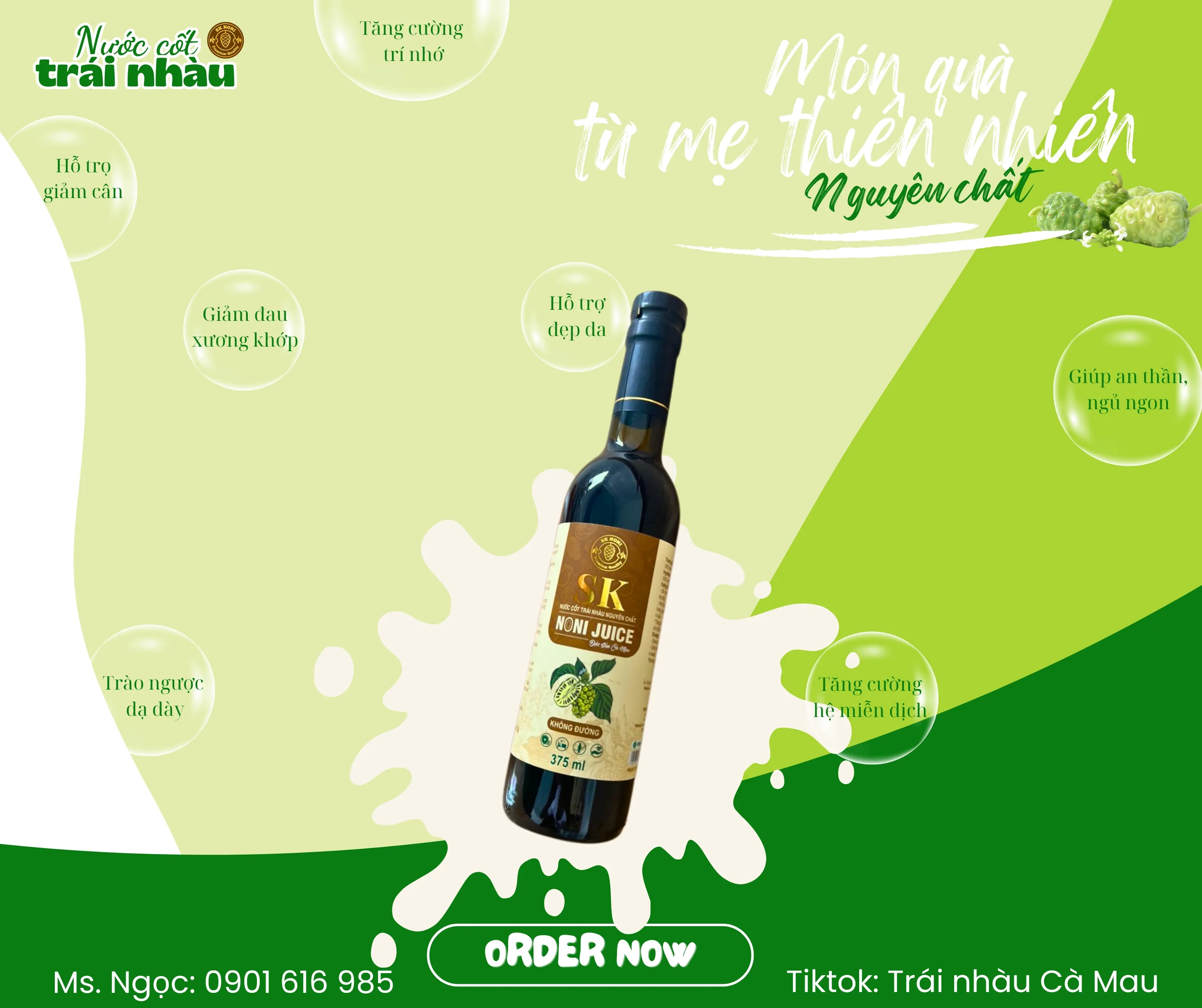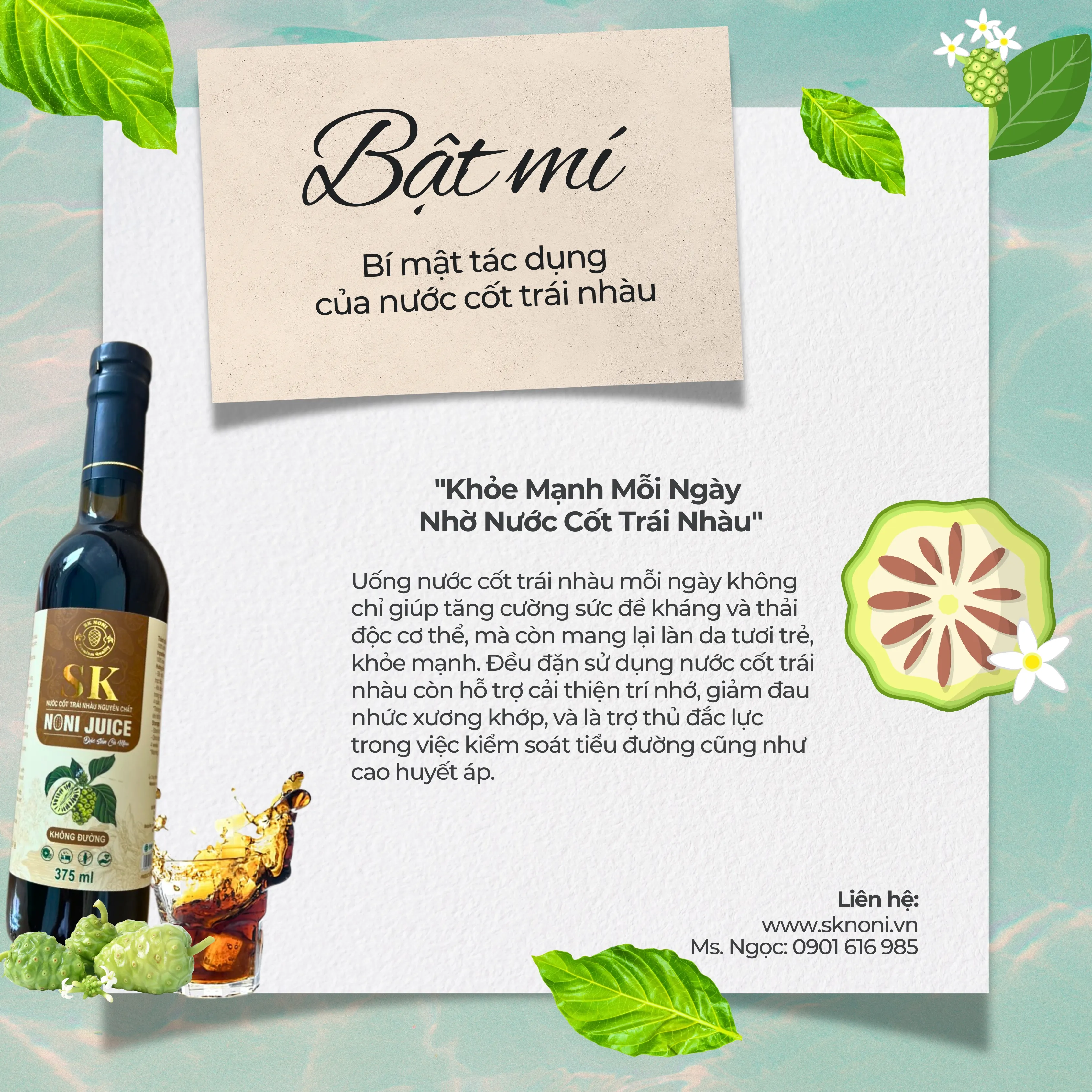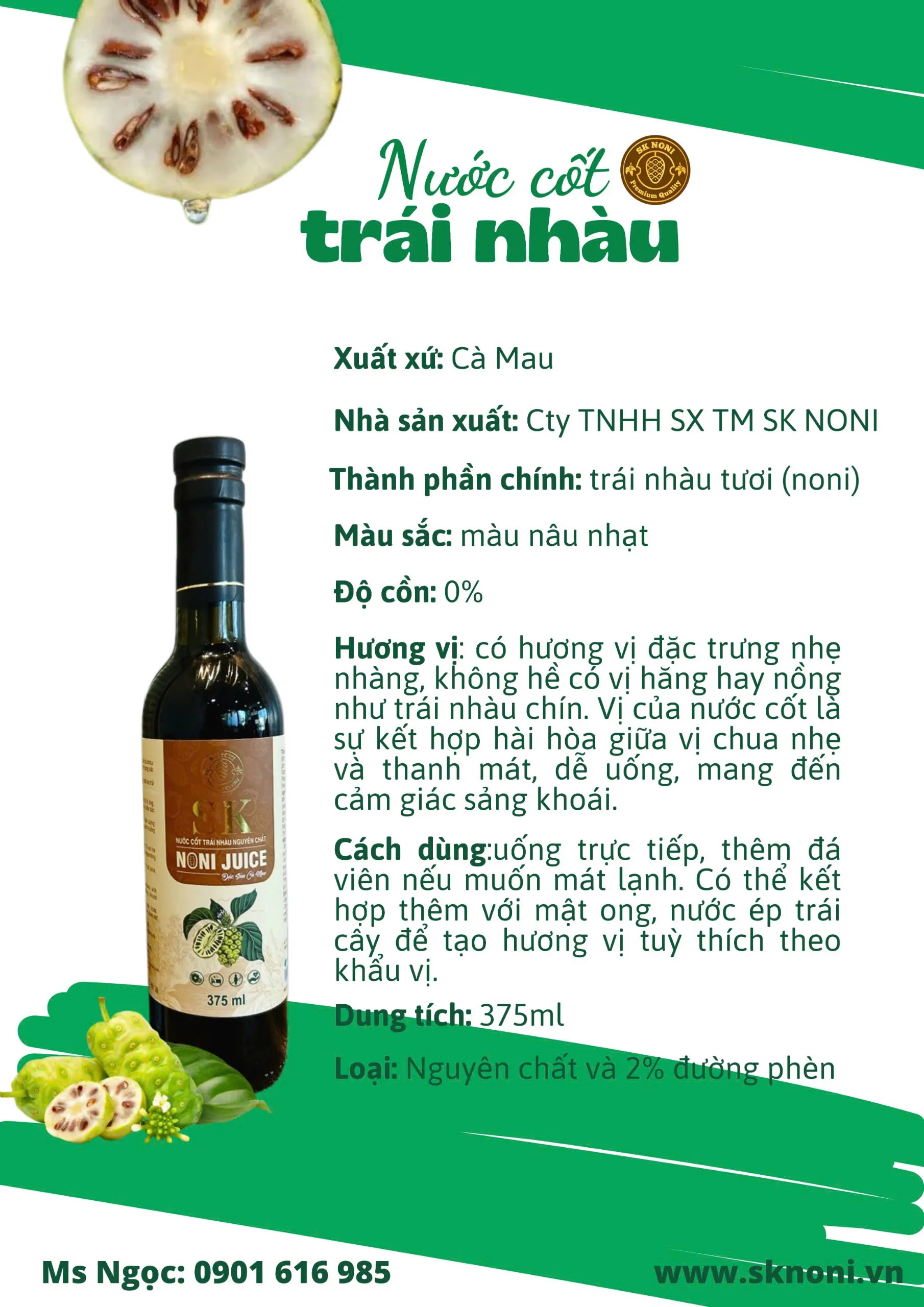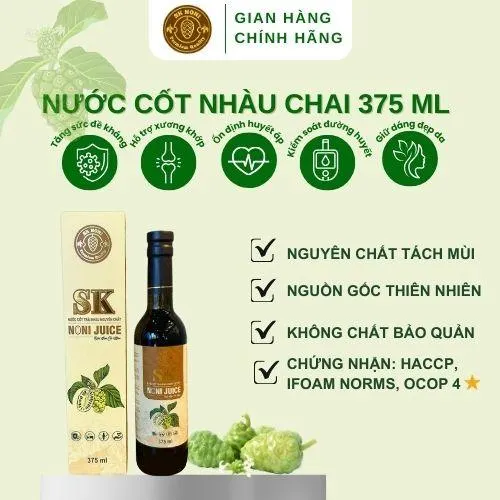 Le jus de Noni SK NONI est un extrait de jus de fruit de Morinda Citrifolia, cultivé dans un jardin séparément planifié et strictement contrôlé de la plantation aux soins techniques ; sans engrais chimiques, sans pesticides. Jus de noni pur et naturel à haute teneur en substances telles que : Mg, Ca, acides aminés, carotène, vitamine C, vitamines B, Fe, K, Na, … a pour effet de compléter les nutriments essentiels, bénéfique pour la santé ; aide à prolonger la jeunesse.