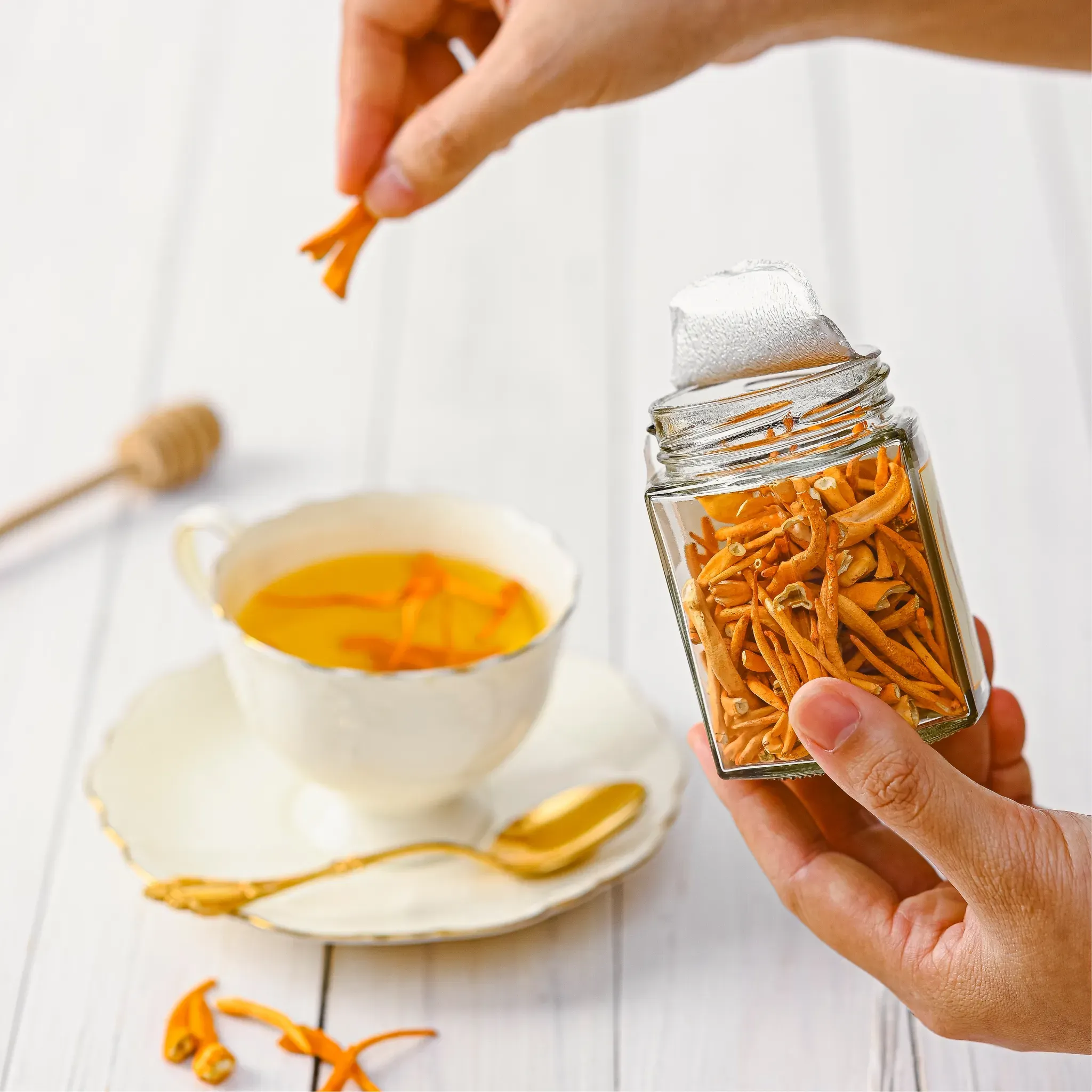 - In infusione con miele: mettere a macerare 12 g di micelio secco in 300 ml di miele per 7 giorni. Assumere 2 cucchiaini di miele ogni mattina prima dei pasti, possibilmente con acqua tiepida e consumare anche i fili.