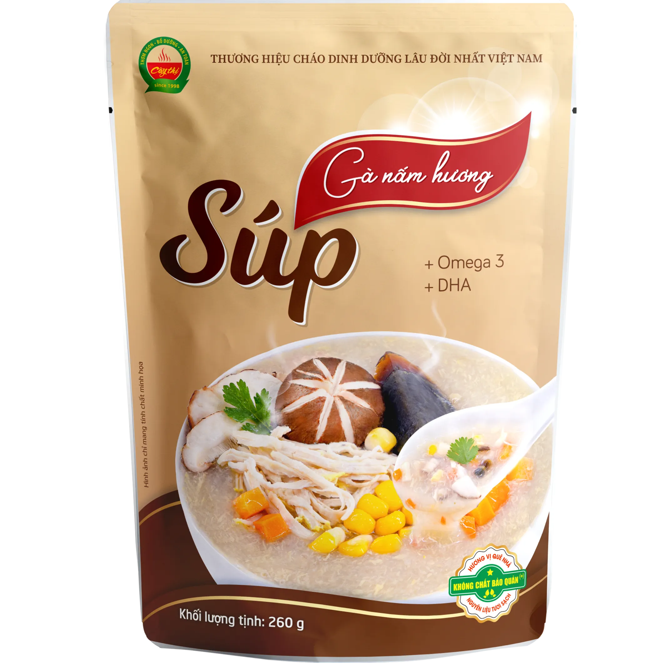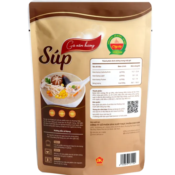 La zuppa di pollo e funghi shiitake di Cây Thi è un prodotto nutriente di alta qualità, progettato esclusivamente per i nostri clienti fedeli, oltre alla nostra linea di porridge fresco e pollo brasato. Il pollo è una fonte di proteine di alta qualità, che fornisce aminoacidi essenziali per il corpo. Le proteine supportano la costruzione, il recupero e rafforzano la funzione immunitaria. Inoltre, il pollo fornisce anche una serie di importanti vitamine del gruppo B, come la vitamina B6 e B12, che svolgono ruoli essenziali nella funzione del sistema nervoso e nella produzione di globuli rossi. I funghi shiitake, un fungo delizioso e popolare, possiedono anche un notevole valore nutrizionale. Sono ricchi di fibre, che aiutano a migliorare la digestione e a mantenere l'equilibrio della glicemia. I funghi shiitake sono anche una ricca fonte di vitamina D, una vitamina essenziale per lo sviluppo e la protezione delle ossa. Inoltre, forniscono minerali come ferro, zinco e selenio, che supportano il sistema immunitario e la funzione cellulare. Combinando pollo e funghi shiitake, questo piatto fornisce nutrienti essenziali come proteine, vitamina B, fibre, vitamina D e minerali per tutta la famiglia. La zuppa di pollo e funghi shiitake di Cây Thi è un piatto delizioso, nutriente e sicuro sia per i bambini che per gli adulti.