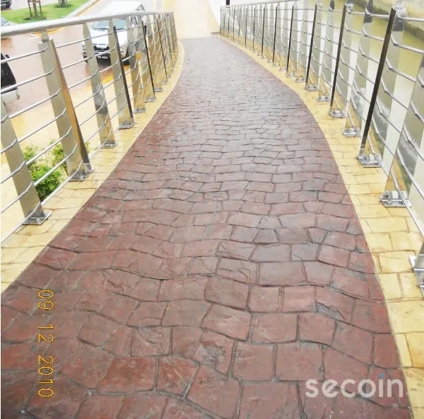 Декоративный бетон Secoin заливается на месте, и пока бетонная основа еще влажная, на поверхность наносится базовый цветной порошок, затем наносится антиадгезионное вещество, создающее цветные прожилки, и используется штамповка для создания текстуры, имитирующей натуральный камень или сланец. После очистки и высыхания декоративный бетон покрывается слоем защитного химического вещества.