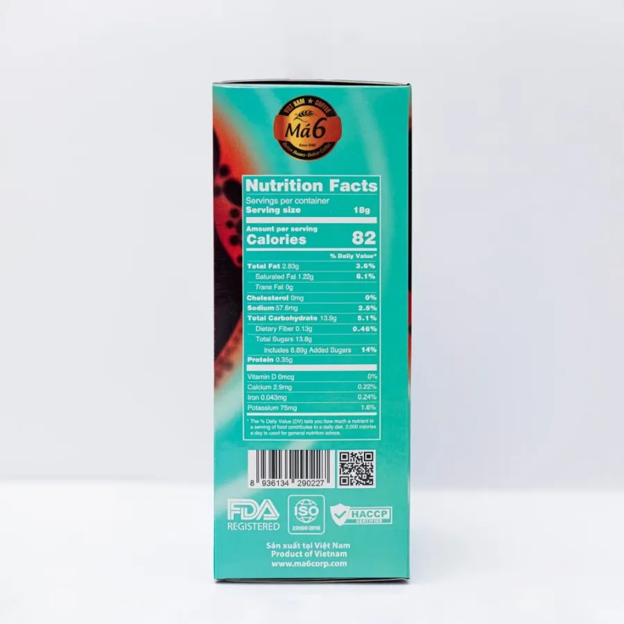 ส่วนผสม: ครีมผงปลอดนม (NDC), ผงกะทิธรรมชาติ (28.5%), กาแฟผสมสำเร็จรูป (11%), มอลโทเดกซ์ทริน, เกลือ, กลิ่นกาแฟผสม