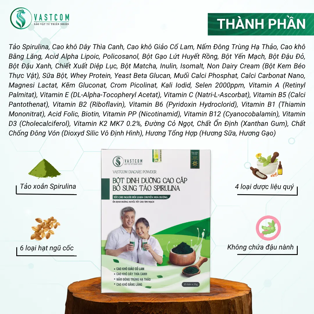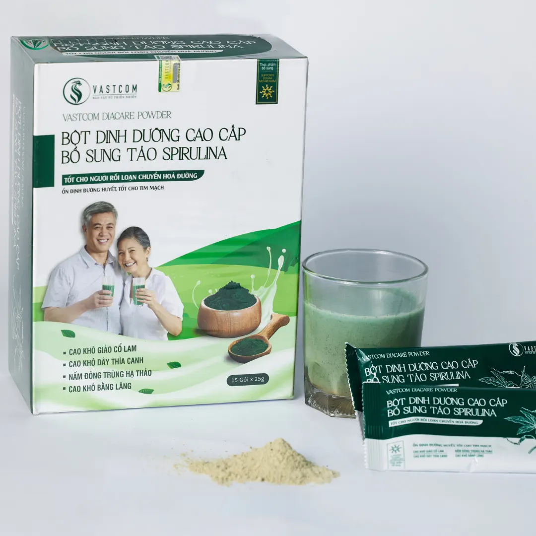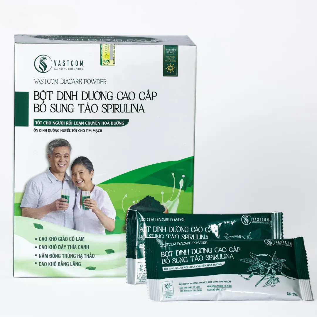 ผลิตภัณฑ์ VASTCOM Diacare Powder, ผงอาหารเสริมสำหรับผู้ป่วยเบาหวานและโรคหัวใจ – กล่อง 15 ซอง เป็นอาหารเสริมทดแทนมื้ออาหารที่อุดมด้วยสารอาหาร ประกอบด้วยส่วนผสมของสาหร่ายสไปรูลิน่า, ถั่งเช่า, สารสกัดจากสมุนไพรแผนโบราณต่างๆ, ธัญพืชที่มีคุณค่าทางโภชนาการ และอื่นๆ อีกมากมาย... อุดมไปด้วย โปรตีน, วิตามิน (A, B, C, D, E, PP,...), แร่ธาตุ (เหล็ก, สังกะสี, แมกนีเซียม, แคลเซียม,...), สารต้านอนุมูลอิสระ (Phycocyanin, เบต้าแคโรทีน) ผลิตภัณฑ์นี้ไม่เพียงช่วยเสริมสร้างสารอาหารทดแทนมื้ออาหารว่าง, ควบคุมระดับน้ำตาลในเลือด, ดีต่อระบบหัวใจและหลอดเลือด แต่ยังช่วยเสริมสร้างภูมิคุ้มกัน, ปรับปรุงระบบย่อยอาหาร และป้องกันมะเร็ง & โรคหลอดเลือดสมอง, เหมาะสำหรับความต้องการในการดูแลสุขภาพแบบองค์รวม