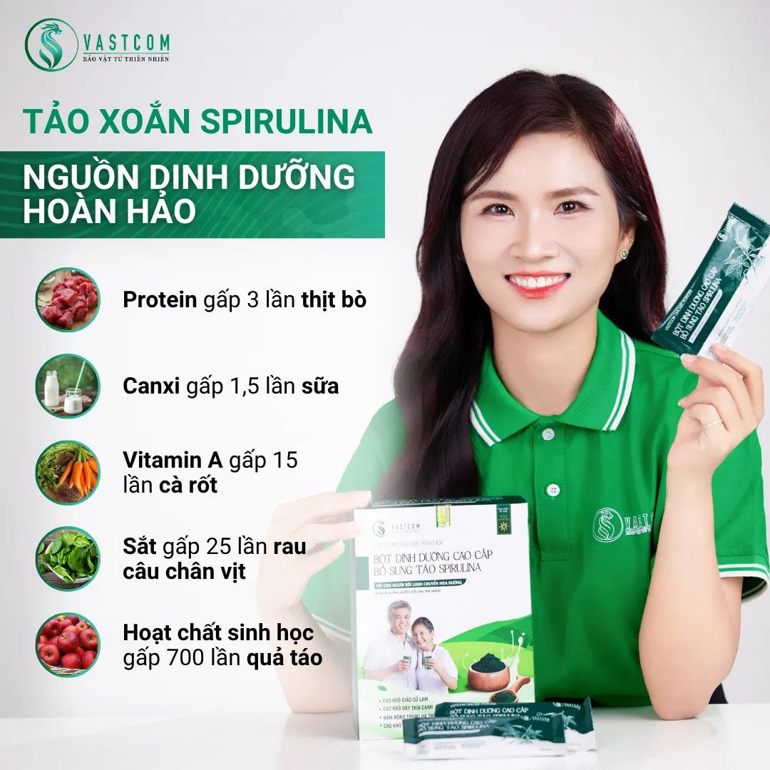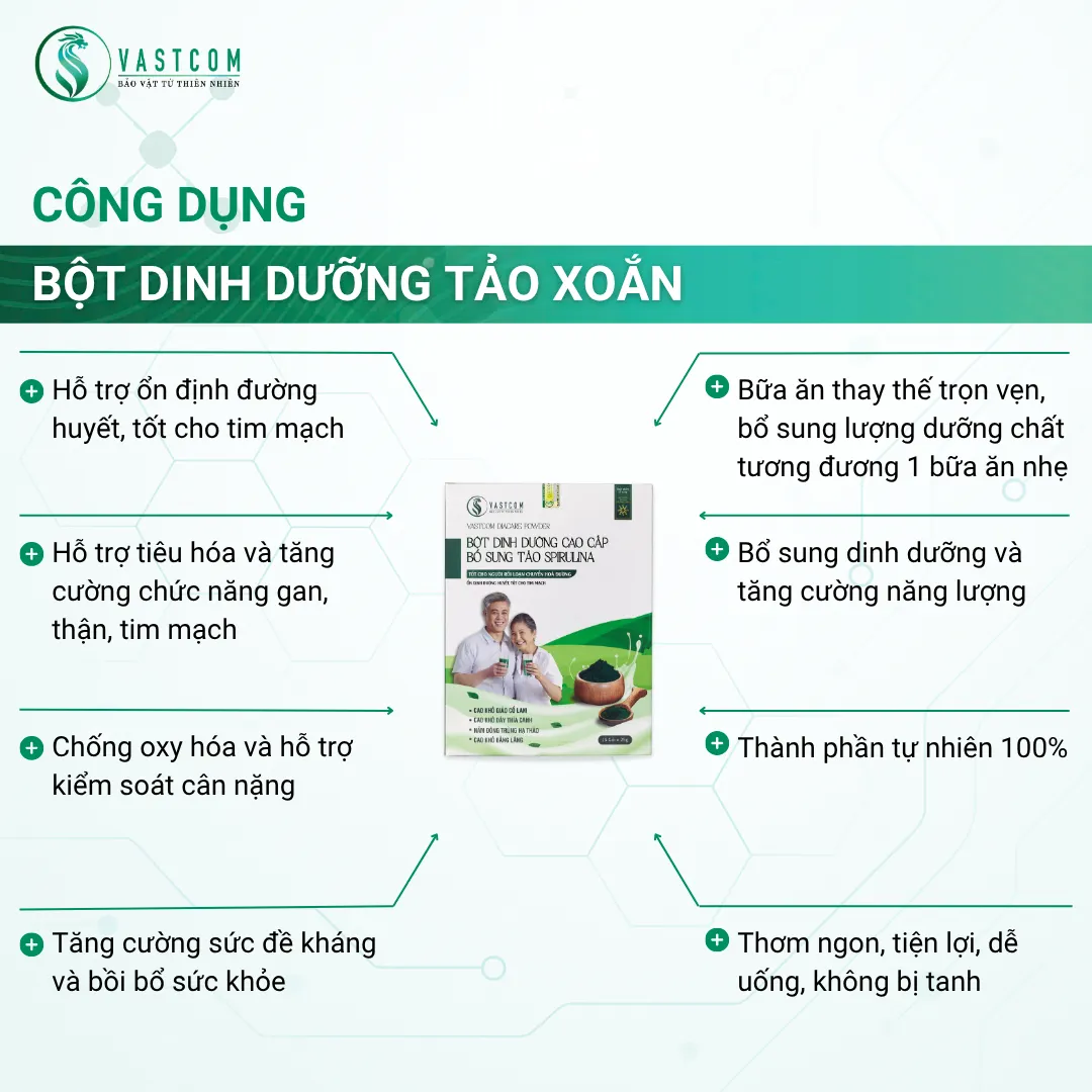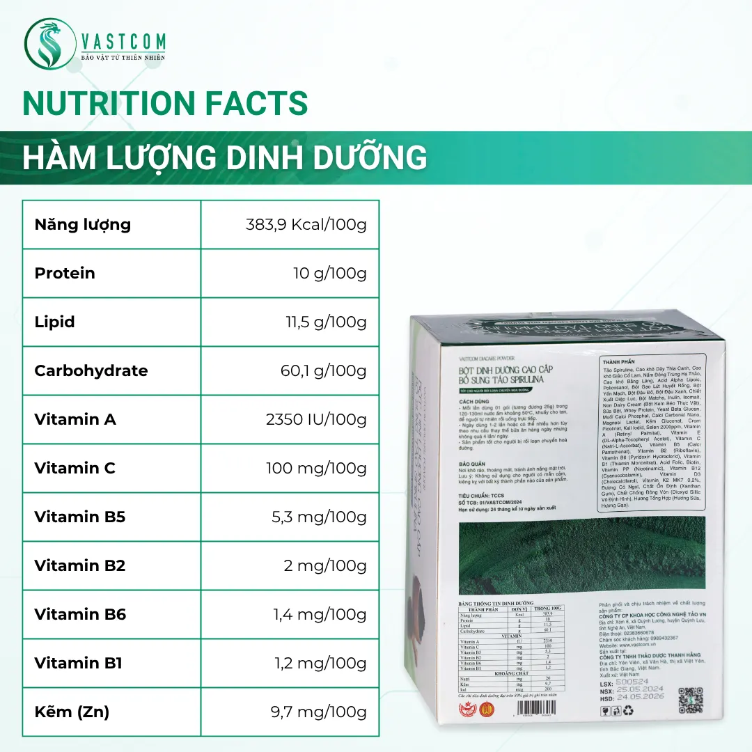 ผลิตภัณฑ์ VASTCOM Diacare Powder, ผงอาหารเสริมสำหรับผู้ป่วยเบาหวานและโรคหัวใจ – กล่อง 15 ซอง เป็นอาหารเสริมทดแทนมื้ออาหารที่อุดมด้วยสารอาหาร ประกอบด้วยส่วนผสมของสาหร่ายสไปรูลิน่า, ถั่งเช่า, สารสกัดจากสมุนไพรแผนโบราณต่างๆ, ธัญพืชที่มีคุณค่าทางโภชนาการ และอื่นๆ อีกมากมาย... อุดมไปด้วย โปรตีน, วิตามิน (A, B, C, D, E, PP,...), แร่ธาตุ (เหล็ก, สังกะสี, แมกนีเซียม, แคลเซียม,...), สารต้านอนุมูลอิสระ (Phycocyanin, เบต้าแคโรทีน) ผลิตภัณฑ์นี้ไม่เพียงช่วยเสริมสร้างสารอาหารทดแทนมื้ออาหารว่าง, ควบคุมระดับน้ำตาลในเลือด, ดีต่อระบบหัวใจและหลอดเลือด แต่ยังช่วยเสริมสร้างภูมิคุ้มกัน, ปรับปรุงระบบย่อยอาหาร และป้องกันมะเร็ง & โรคหลอดเลือดสมอง, เหมาะสำหรับความต้องการในการดูแลสุขภาพแบบองค์รวม