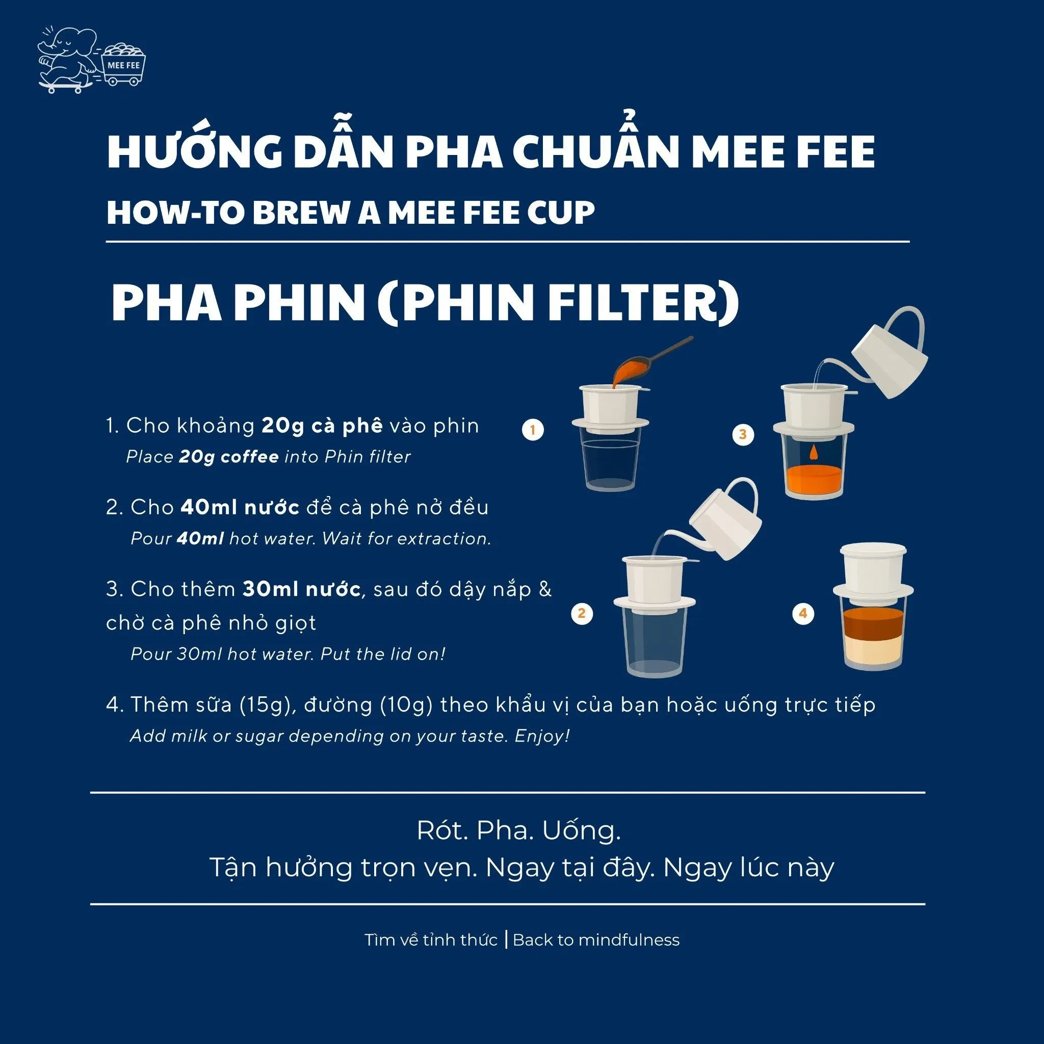 การชงแบบ Phin (เวียดนาม) ด้วยอัตราส่วนผงกาแฟ 15 กรัม ต่อน้ำกาแฟเข้มข้น 75 มล. คุณสามารถเติมนมหรือครีมเพื่อเน้นรสชาติช็อกโกแลตที่นุ่มนวลยิ่งขึ้น