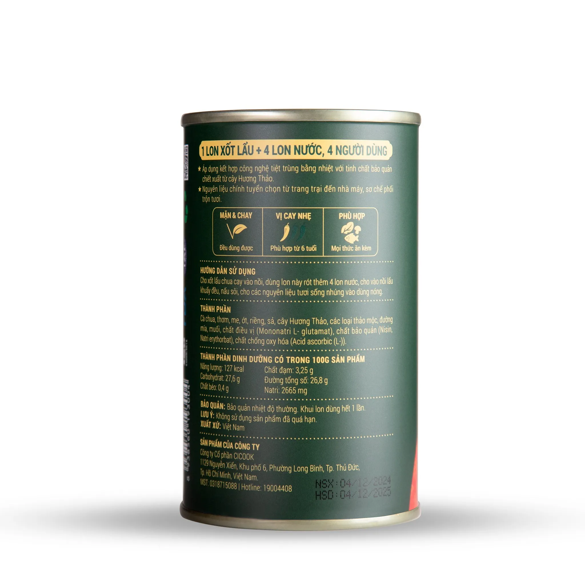 น้ำซุปต้มยำรสเผ็ด CiCook เป็นทางออกที่ยอดเยี่ยมสำหรับผู้ที่ต้องการลิ้มลองรสชาติต้มยำกุ้งรสชาติต้นตำรับได้ที่บ้านโดยไม่ต้องปรุงแต่ง ผลิตภัณฑ์นี้บรรจุในกระป๋องดีบุก 400 มล. ที่ดูหรูหรา สะดวก และง่ายต่อการเก็บรักษา ด้วย Cicook คุณเพียงแค่เติมน้ำและส่วนผสมก็จะได้ต้มยำกุ้งที่อร่อยอย่างเหลือเชื่อแล้ว