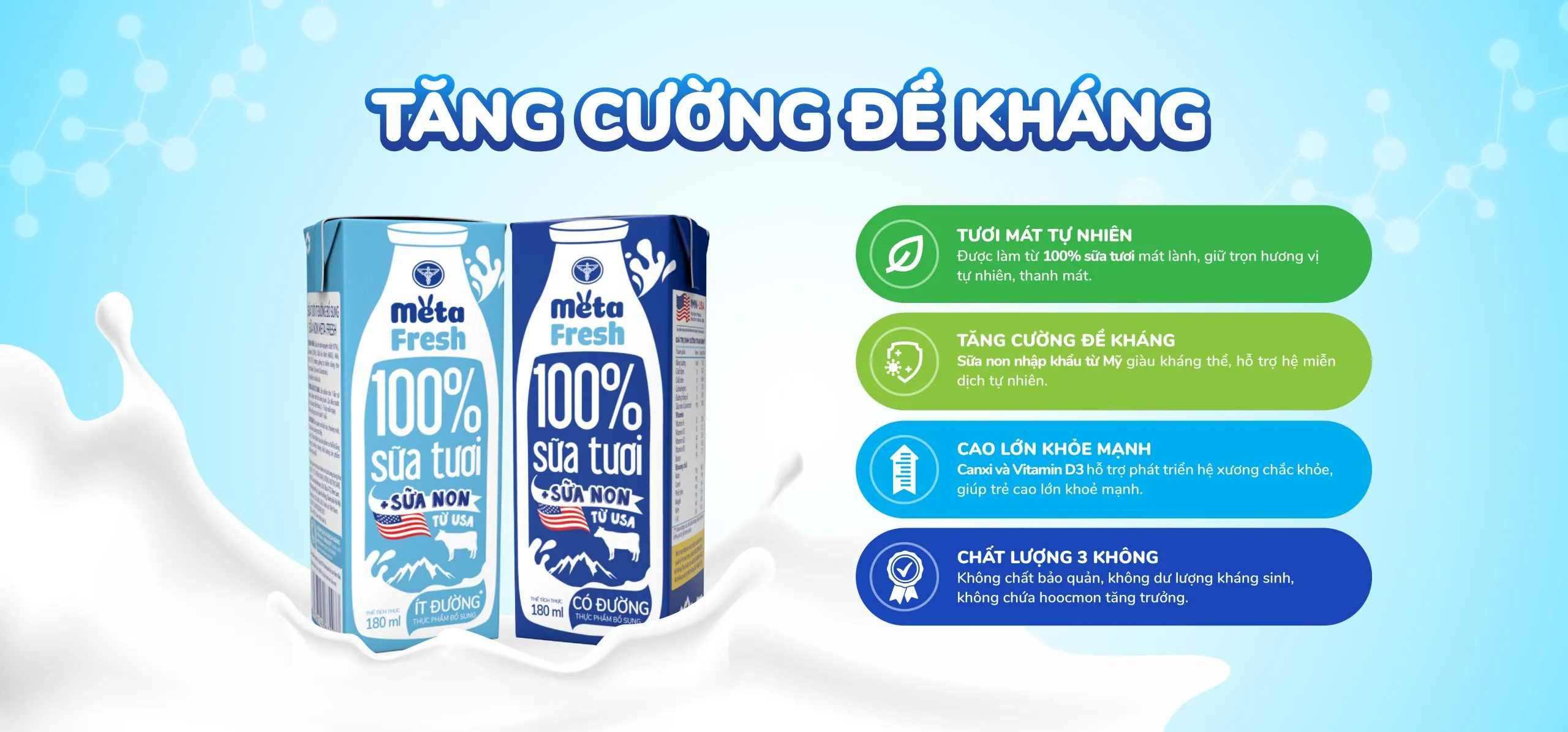 Sữa tươi Meta Fresh mang đến nguồn dinh dưỡng mát lành tự nhiên, hỗ trợ tăng cường đề kháng, đồng hành cùng bé trong hành trình lớn khôn khỏe mạnh.