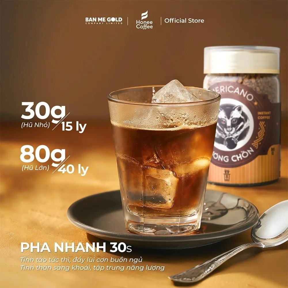 Cà phê sấy lạnh Hương Chồn Americano là lựa chọn lý tưởng cho những ai muốn thưởng thức một tách cà phê nhanh chóng chỉ trong 15 giây mà vẫn giữ trọn hương vị nguyên bản. Với hương Chồn đặc trưng, mộc mạc, sản phẩm từ Honee Coffee không chỉ tiện lợi mà còn mang đến trải nghiệm đậm đà và thơm ngon nhất đến với bạn!