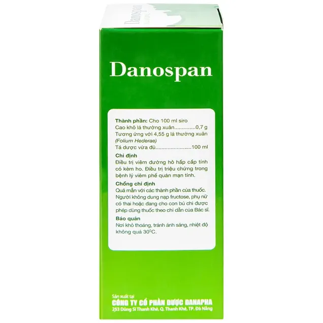 Lưu ý đặc biệt: Cũng như các chế phẩm có nguồn gốc chiết xuất từ thực vật, màu của siro Danospan đôi khi có thể bị thay đổi. Tuy nhiên, điều này không ảnh hưởng đến hiệu quả điều trị của thuốc.
