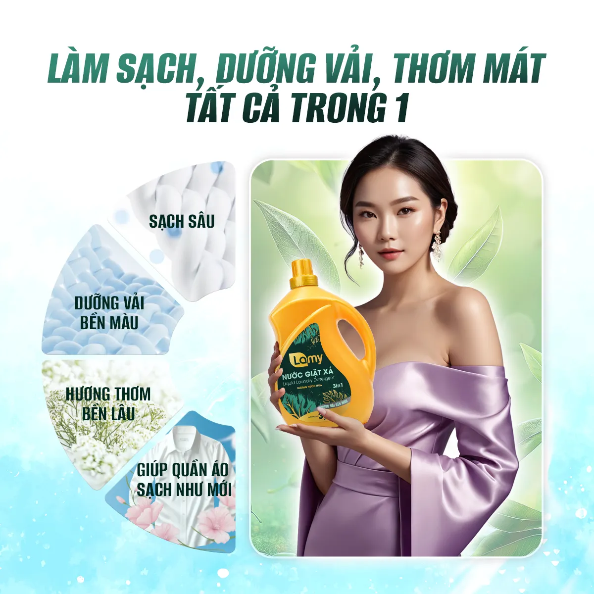 Nước giặt xả 3 trong 1 LAMY là lựa chọn hoàn hảo cho mọi gia đình, kết hợp ba công dụng trong một sản phẩm duy nhất. Công thức độc đáo giúp dưỡng vải bền màu, giữ cho quần áo luôn tươi mới và không bị phai màu qua nhiều lần giặt. Đồng thời, sản phẩm mang lại hiệu quả trắng sạch như mới, loại bỏ vết bẩn cứng đầu một cách dễ dàng. Hơn nữa, với hương nước hoa thiên nhiên, nước giặt xả LAMY giúp quần áo thơm mát cả ngày, mang lại cảm giác dễ chịu và tự tin suốt cả ngày dài.