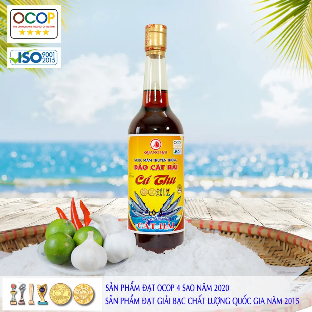 Nước mắm Cát Hải – Nước mắm truyền thống Quang Hải là sản phẩm được sản xuất từ nguồn nguyên liệu chọn lọc từ những mẻ cá biển tươi ngon nhất, sau khi đánh bắt được sơ chế ngay để giữ nguyên độ tươi ngon. Chượp Ủ theo phương pháp truyền thống với tỉ lệ 3 cá : 1 muối và được chăm sóc đánh đảo hàng ngày giúp cho nguyên liệu chín đều, chính vì phương pháp chế biến đã tạo hương vị khác biệt của nước mắm Quang Hải.