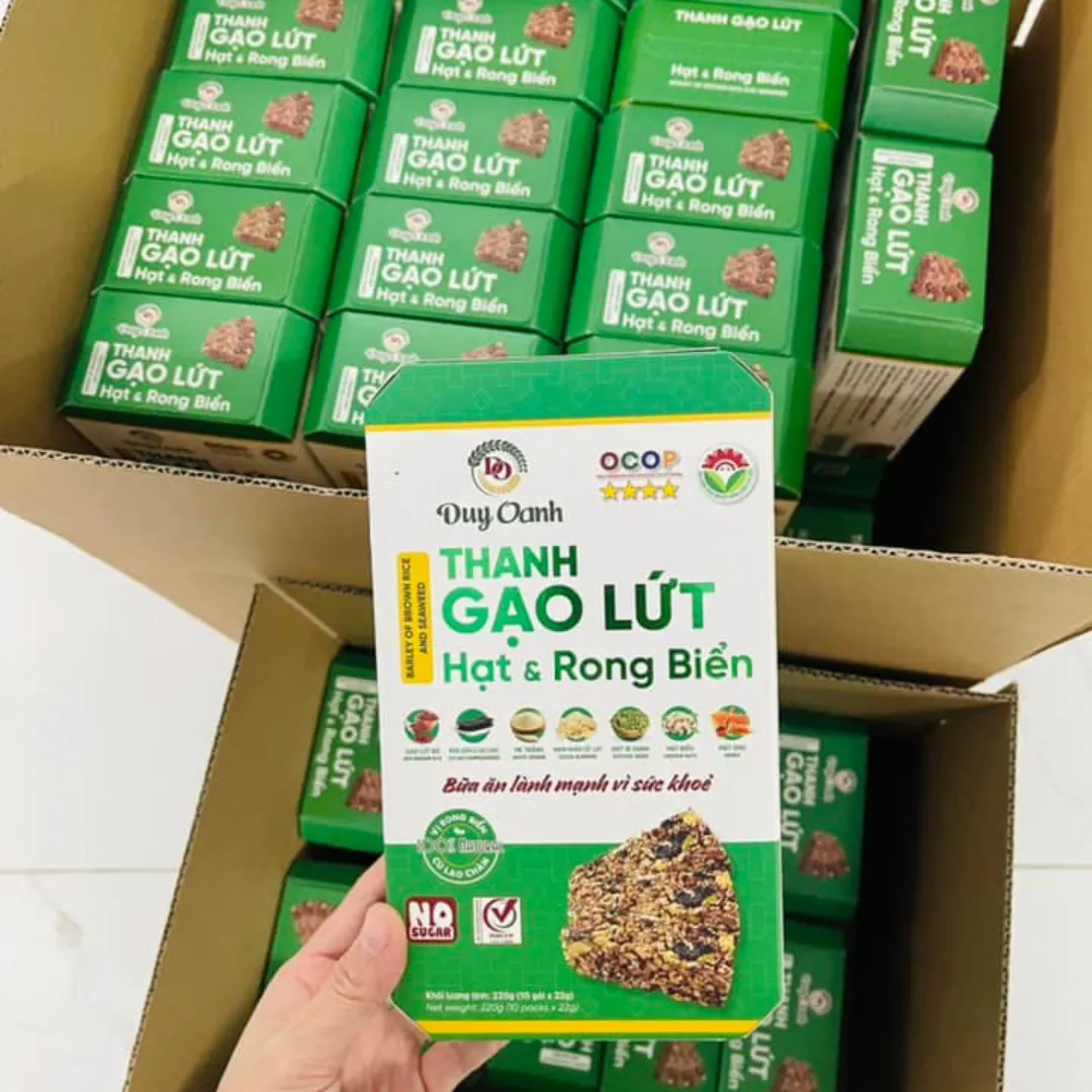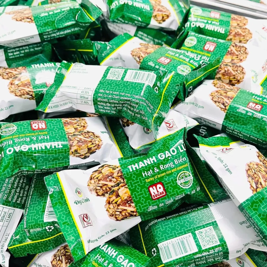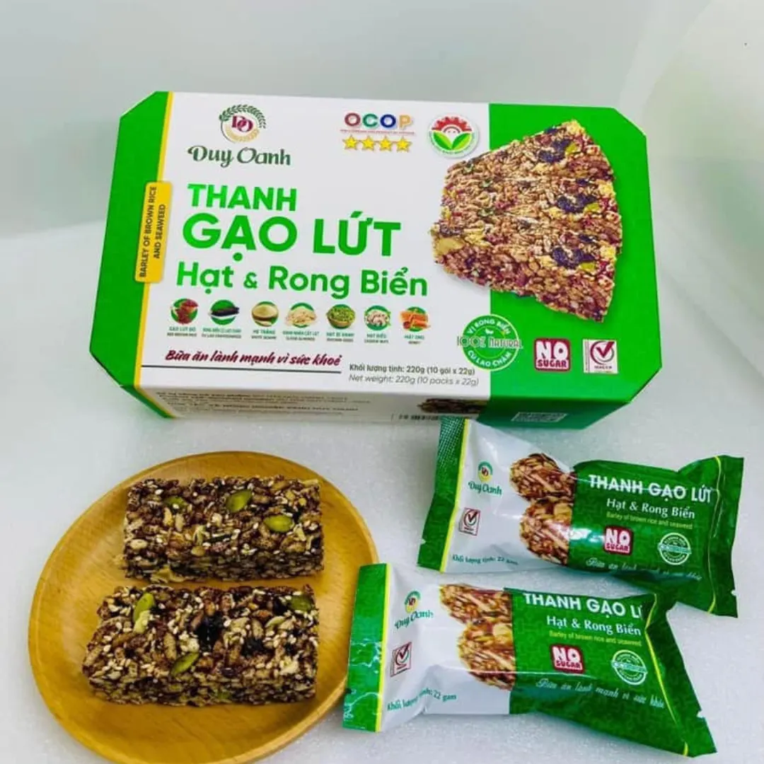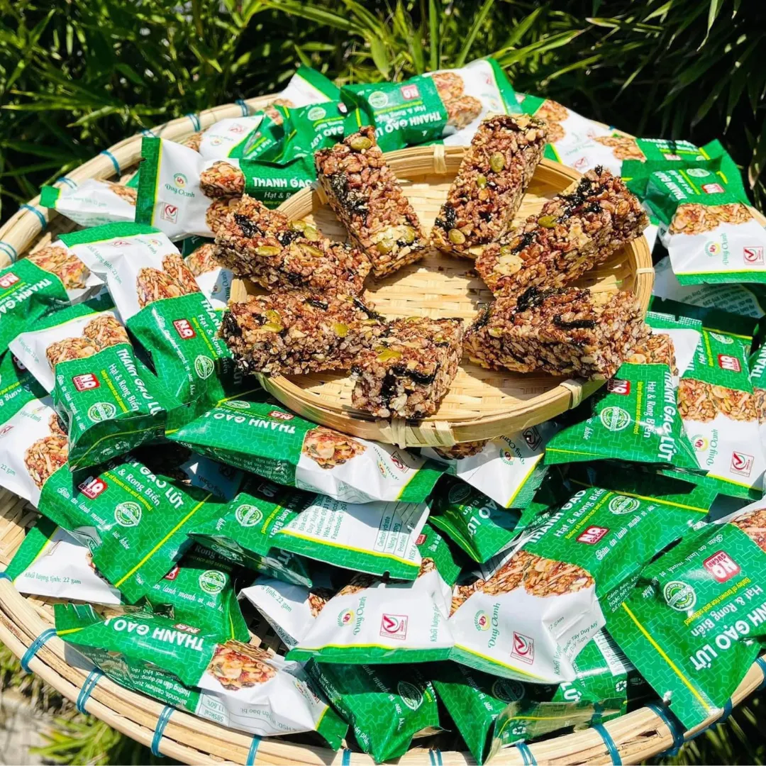 Sản phẩm trong hình là thanh gạo lứt dinh dưỡng – một loại snack lành mạnh được chế biến từ các nguyên liệu tự nhiên, thường dùng làm món ăn vặt hoặc bữa phụ tiện lợi, bổ dưỡng.