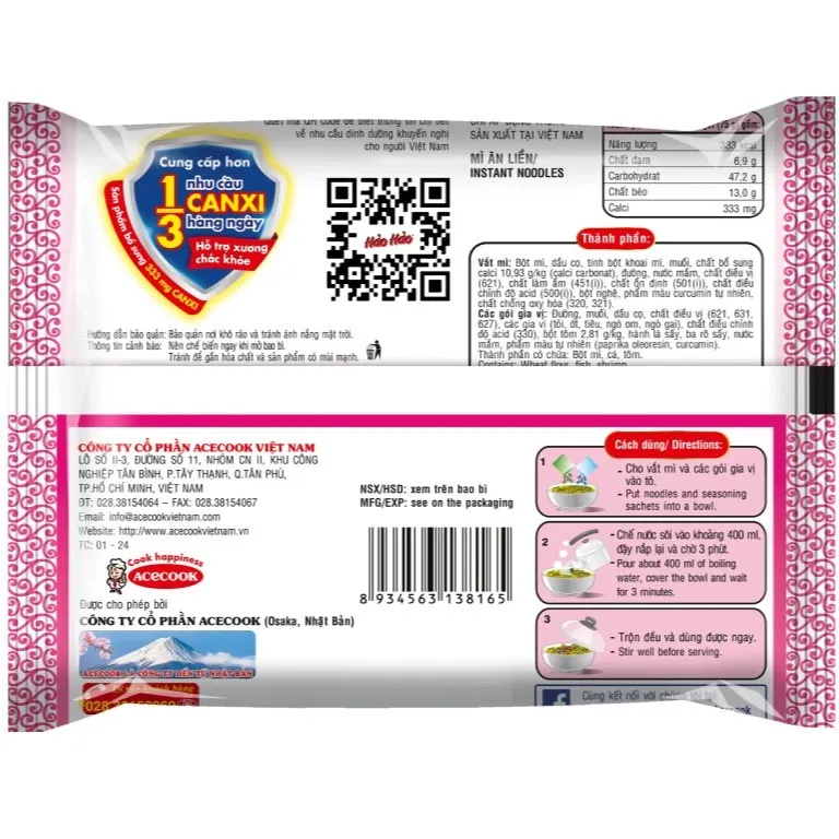 Sợi mì Hảo Hảo được làm từ bột mì, bổ sung vi chất kẽm và sắt tốt cho cơ thể, gói súp với gia vị chua cay hài hòa, hợp khẩu vị nhiều người. Sản phẩm cung cấp các chất dinh dưỡng thiết yếu như protein, carbohydrate và chất béo