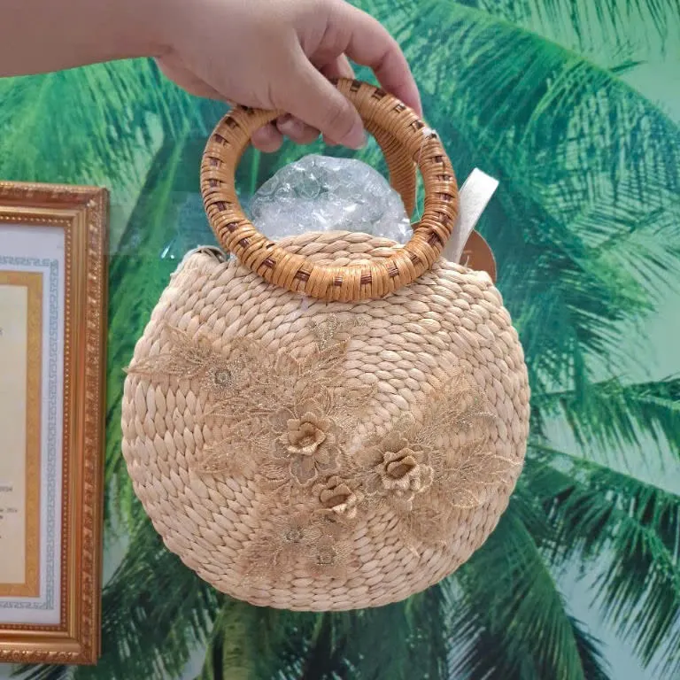 Chiếc túi cói tròn xinh xắn mang phong cách thủ công mộc mạc kết hợp với hoa văn thêu tay tinh tế, là điểm nhấn hoàn hảo cho những cô nàng yêu sự nhẹ nhàng, tự nhiên và độc đáo.