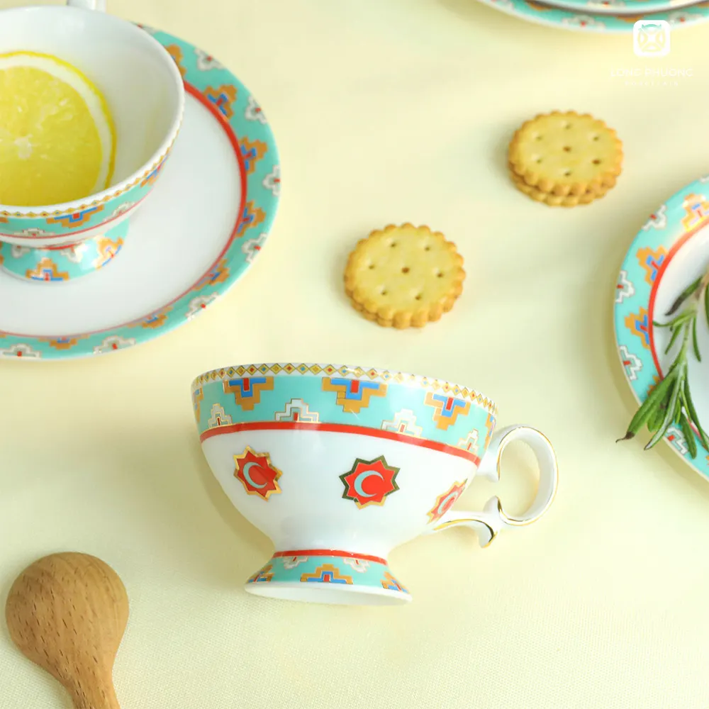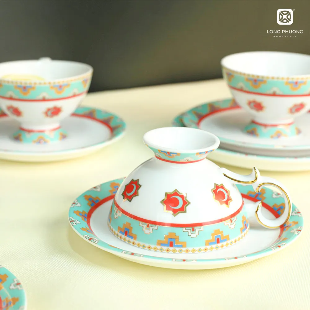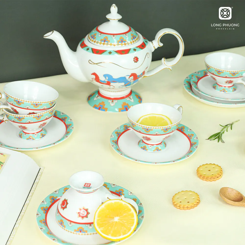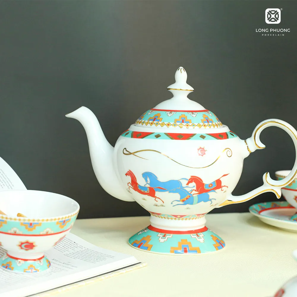 马 đáo茶具套装造型新颖独特,带有浓厚的欧式风格。茶壶线条流畅优美。壶柄和底座经过精心设计,更显华贵,为茶桌增添一抹皇室般的优雅。
