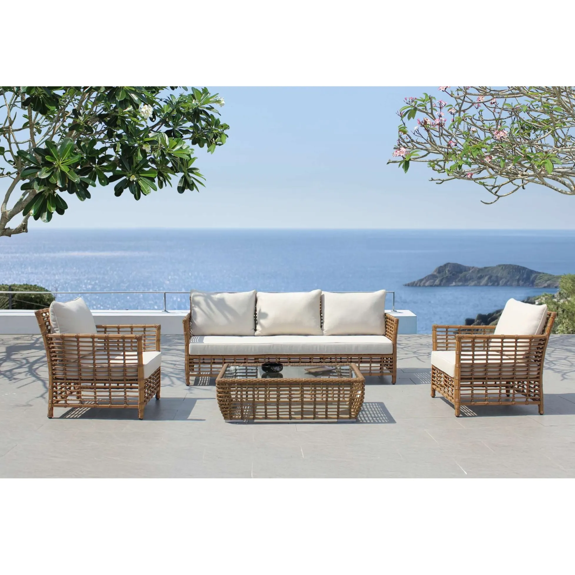 户外材料:Poly Bamboo HDPE 仿竹塑料纤维、铝制框架、12 厘米厚坐垫、250 克防水无边面料。