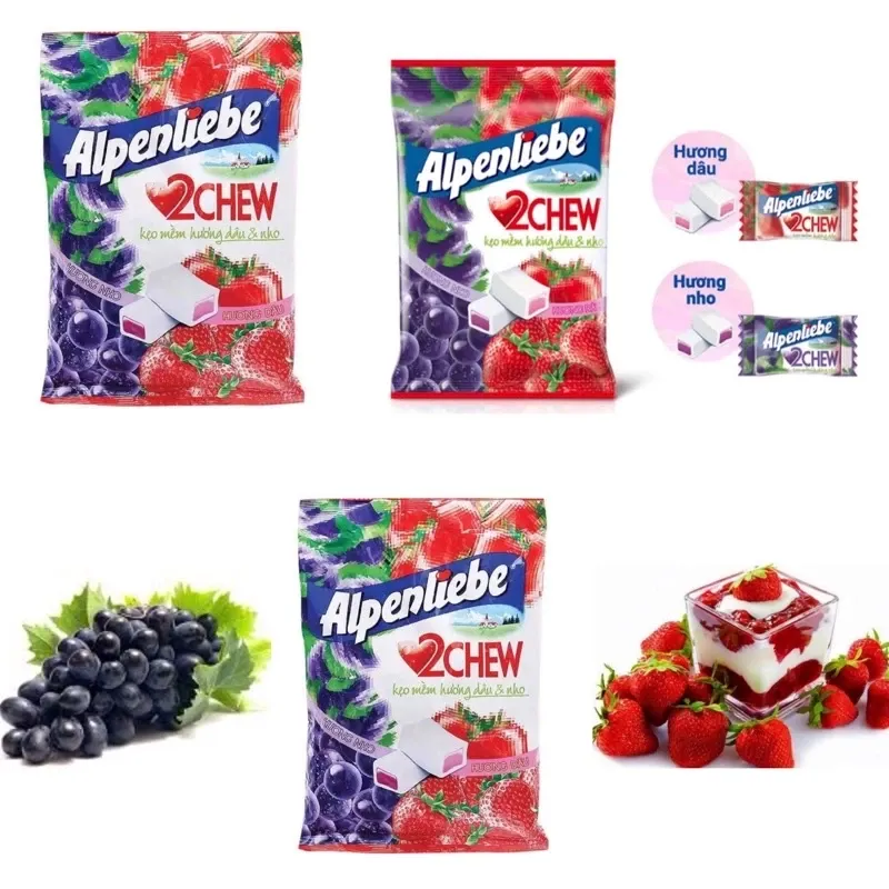 阿尔卑斯2Chew葡萄&草莓味软糖,口感柔软,融合了葡萄&草莓的香甜果味。糖果设计为可长时间咀嚼和品尝,带来香甜软糯的体验。适用于休闲零食、作为礼物或在糖果店零售。