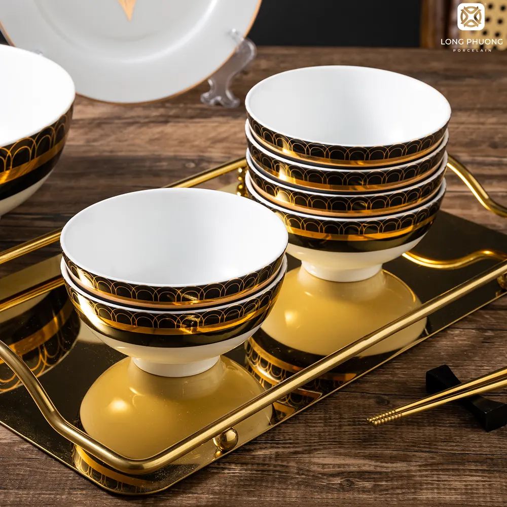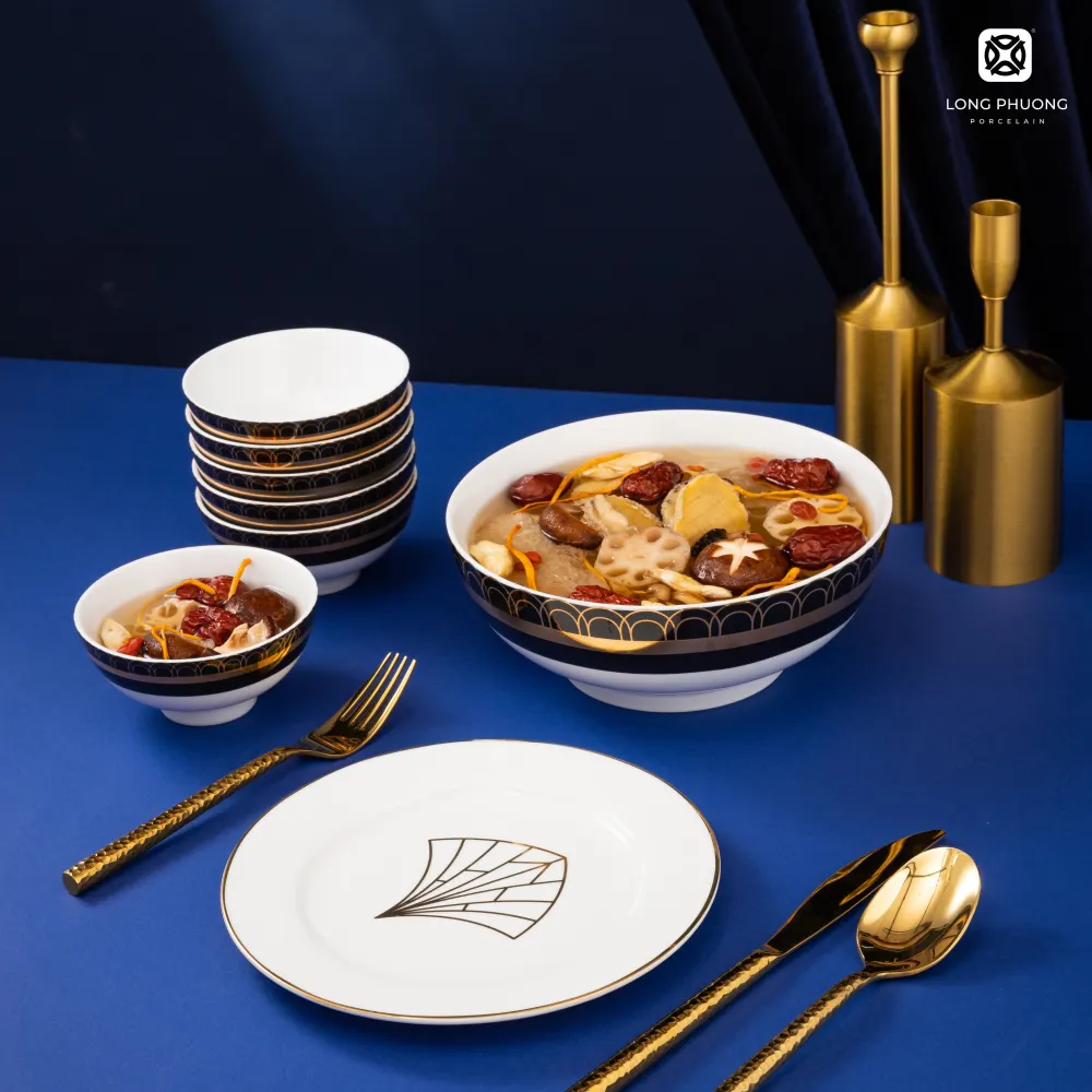 Kim Lai – 家庭餐具礼品套装采用新古典主义设计风格,再现欧洲夜空中奢华壮丽的景象。迷人的黑色出现在明亮的白色瓷器背景上,使产品对比鲜明。用24K黄金绘制的柔和对称的拱形图案成为迷人的亮点,为用餐空间增添奢华感。