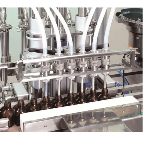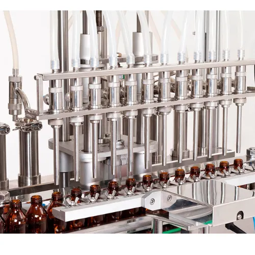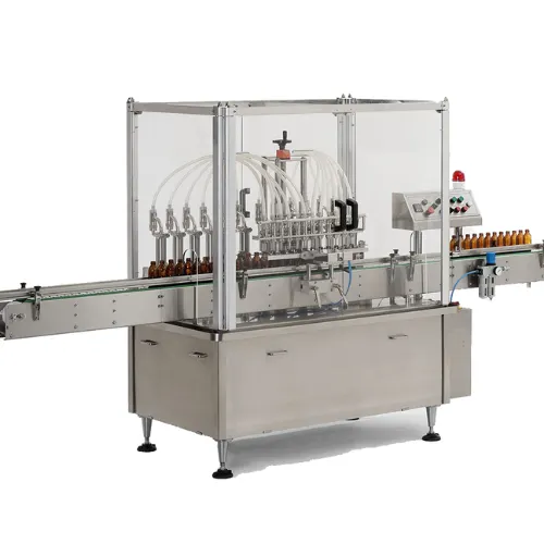 多头自动液体灌装机是工业生产线上的专用设备,可高精度、快速、均匀地将溶液灌装到瓶/罐中。该机器采用高级不锈钢设计,确保食品安全卫生,易于操作,并可与其他工序集成,如:瓶子输送 - 盖帽 - 贴标 - 包装。